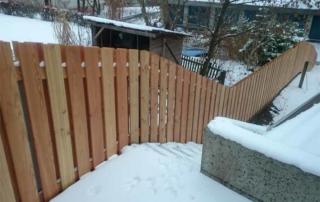 Die klassische und sehr beliebte Sichtschutzwand mit wechselseitig aufgenagelten Brettern wurde hier in Lärche natur, splintfrei ausgeführt. Diese Sichtschutzwand besticht durch ihre Optik und Robustheit. Die Anpassung an die Treppe wurde direkt vor Ort durch unser Montageteam vorgenommen.