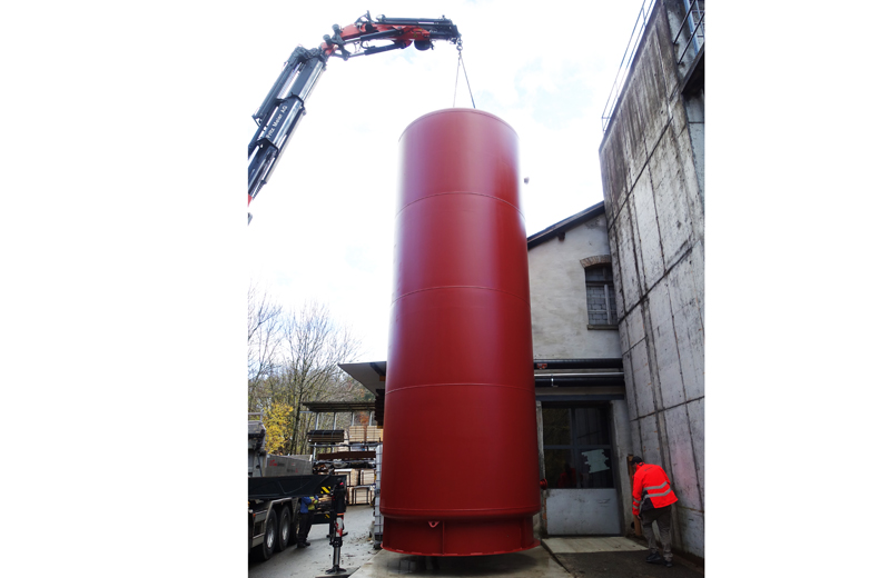 Der 5.5 Tonnen schwere und 9 Meter lange Warmwasser-Aussenspeicher mit 3 Metern Durchmesser steht. Mit den Kranwagen von Michi Meier (Fritz Meier AG) und der Hebebühne der Firma Gonon AG konnte der Speicher für 60’000 Liter innerhalb kürzester Zeit vom Lastwagen gehoben und am definitiven Standort positioniert werden. Wir danken allen Beteiligten für die tolle und effiziente Arbeit.
