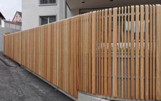 Dieser Auftrag war eine interessante Herausforderung für uns. Die unterschiedlich breiten Staketen in Lärche natur wurden auf U-Stahltraversen geschraubt, für die Bögen wurde Flachstahl verwendet. Als Torrahmen kam Vierkantstahl zum Einsatz. Der Zaun wurde mit unterschiedlichen Höhen und Schweifungen ideal der Umgebung angepasst. Vielen Dank für diesen tollen Auftrag!